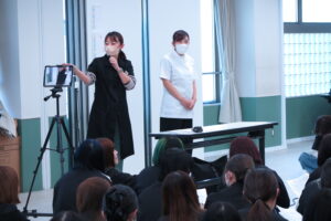 実技試験に向けて、衛生面についての説明を、先生が白衣を着用して実演しながら