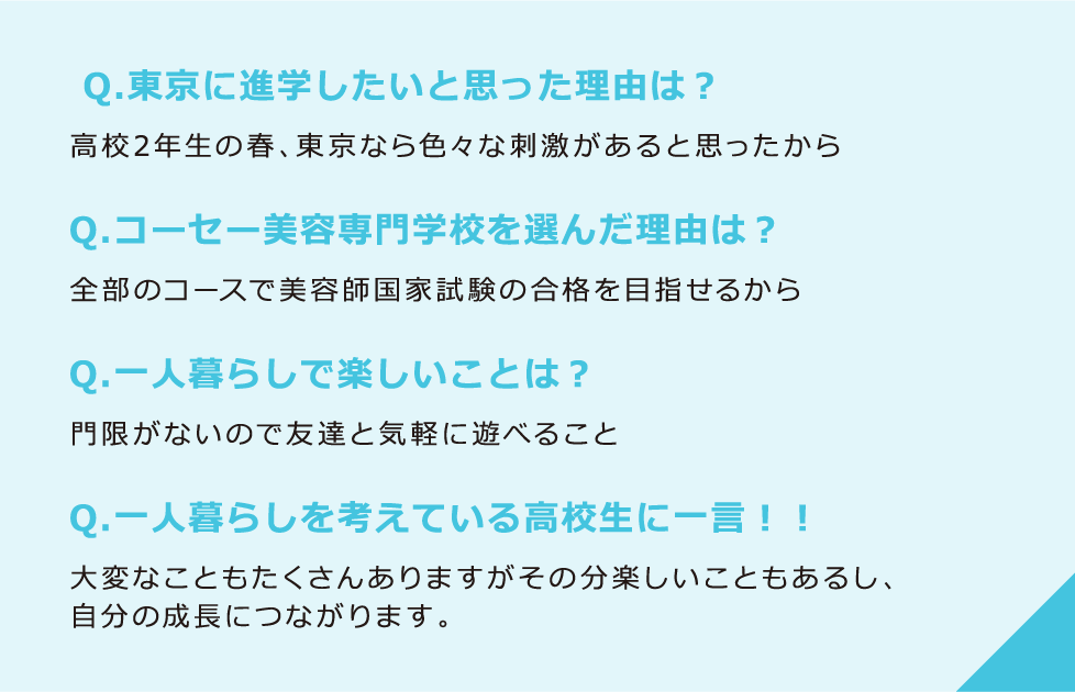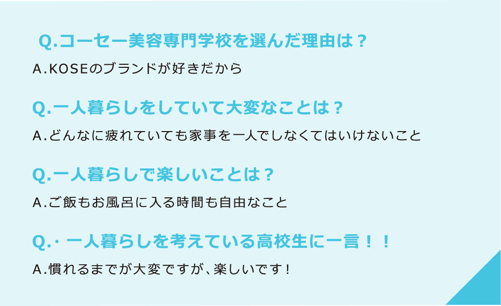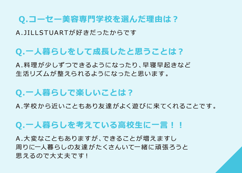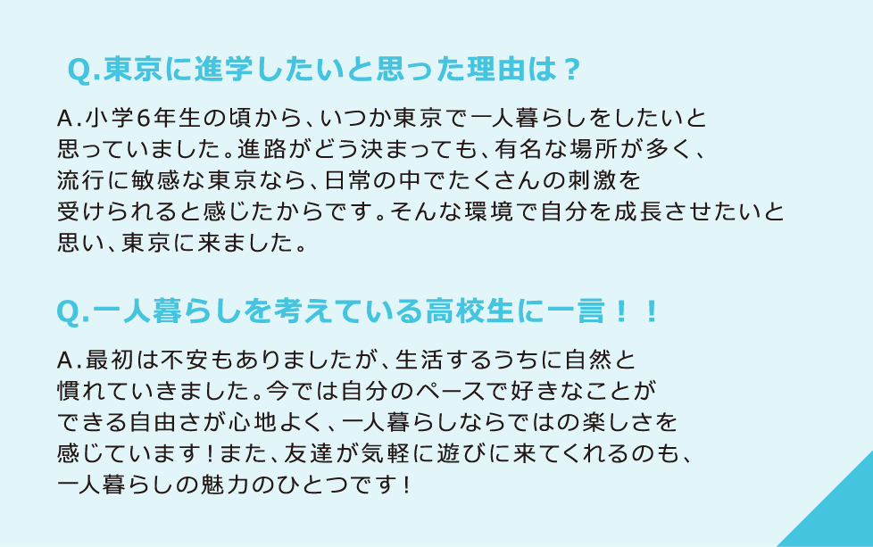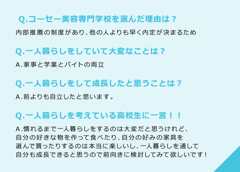 はじめてのひとり暮らしで充実した生活が送れるよう生活環境をサポートします。 また、学生に向いている物件を探すお手伝いをしてくださる提携企業があり安心です。