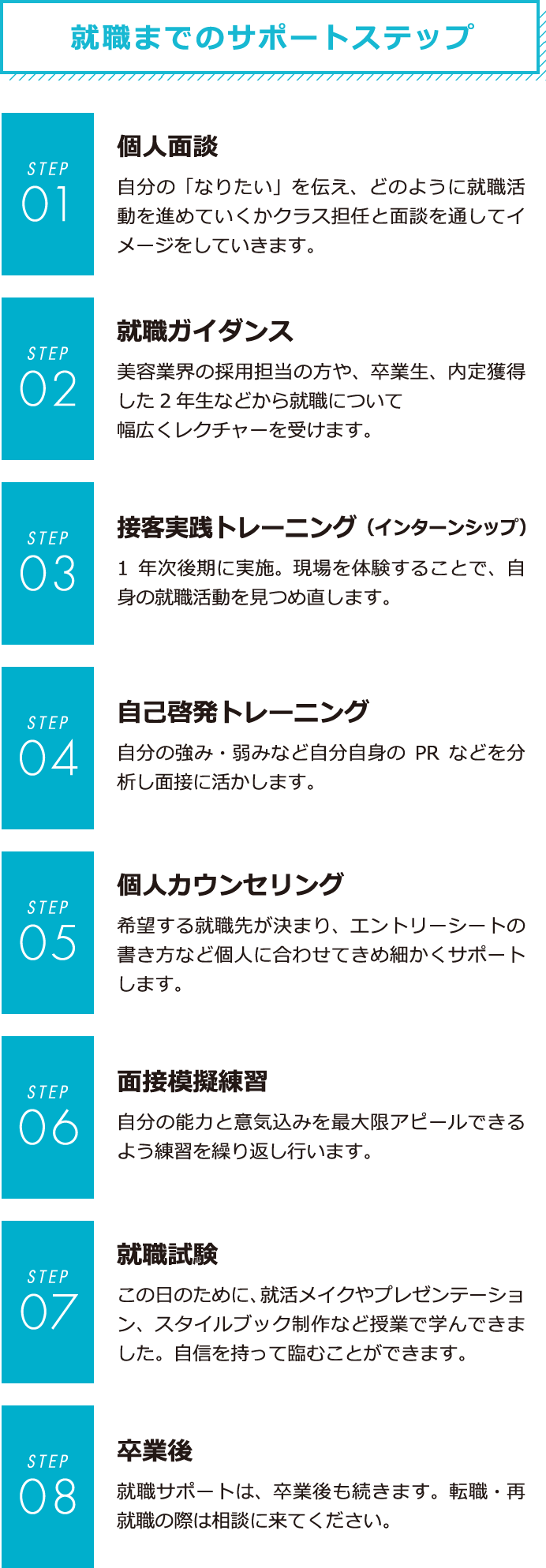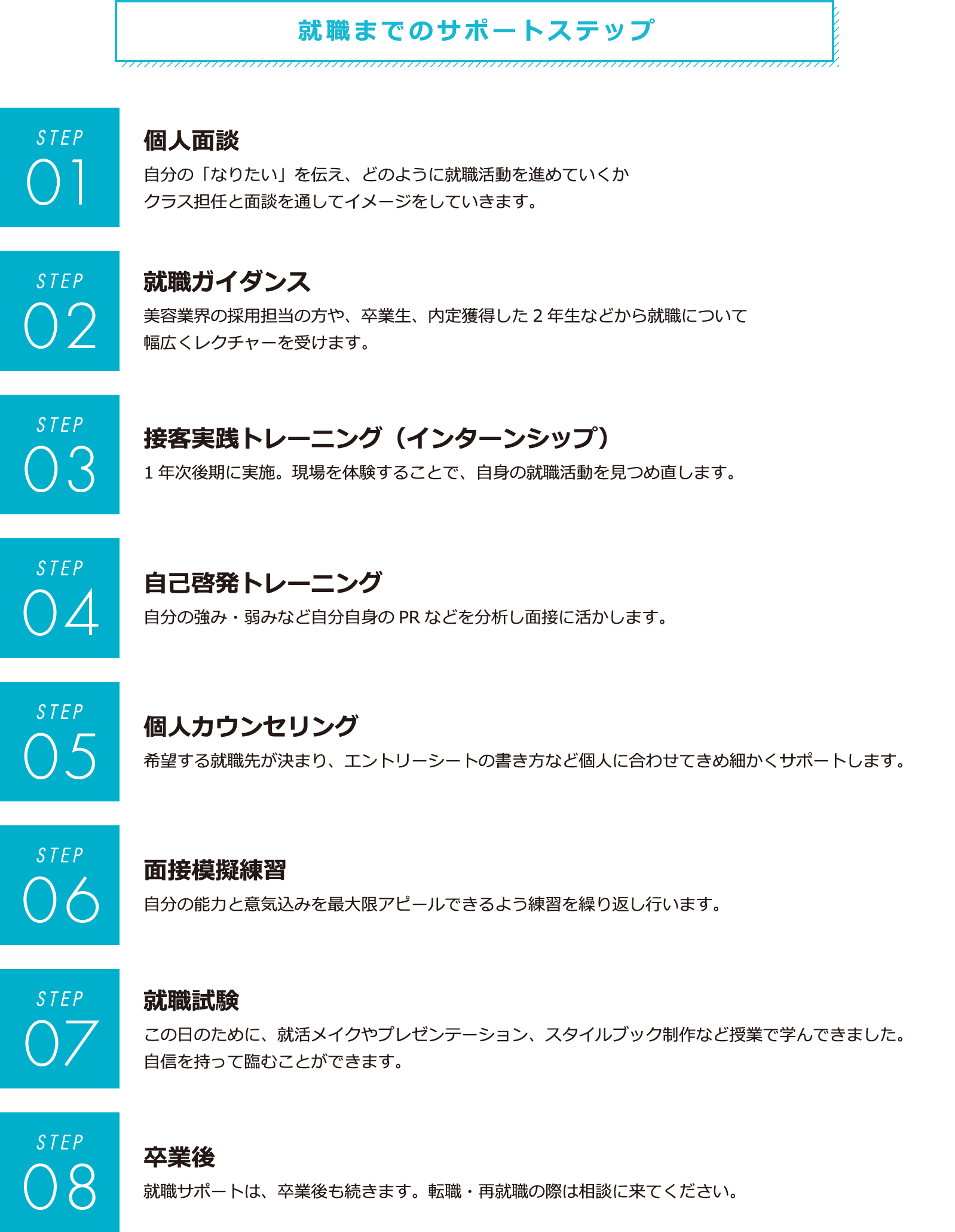 長年の美容業界での経験、大手ディーラーとの強いつながりや就職先との強固な信頼関係を活かし、一人ひとりの希望に合わせた就職指導を行っています。1年次に美容室、コーセー化粧品店頭での接客実践トレーニングを実施し働く意識を学び、企業説明会、面接マナー授業などを通して美容業界で活躍できるようあなたを応援します。
