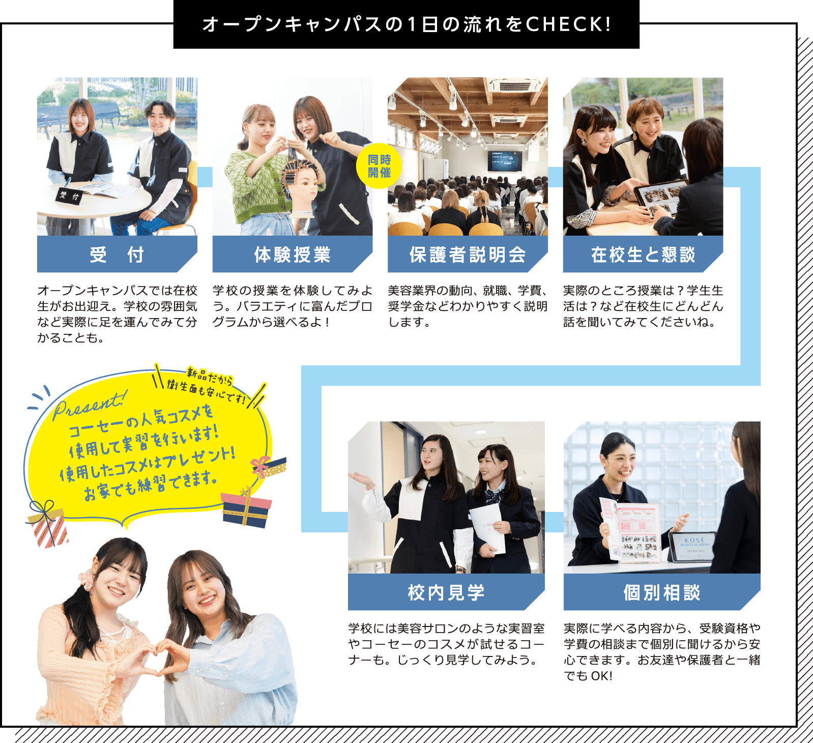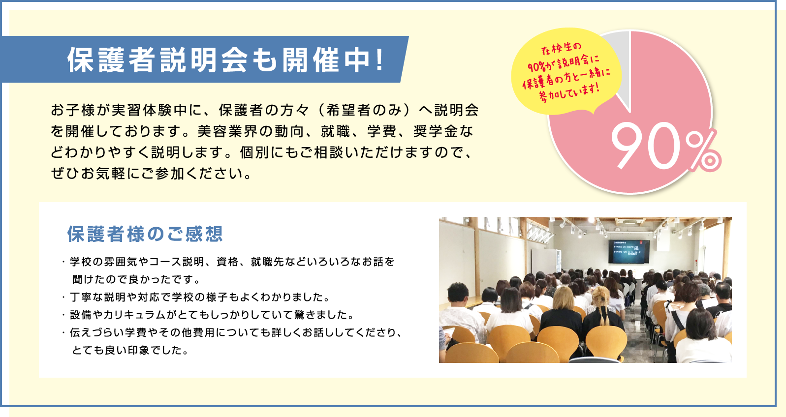 美容業界の動向、就職、学費、奨学金などわかりやすく説明。個別にもご相談いただけます。